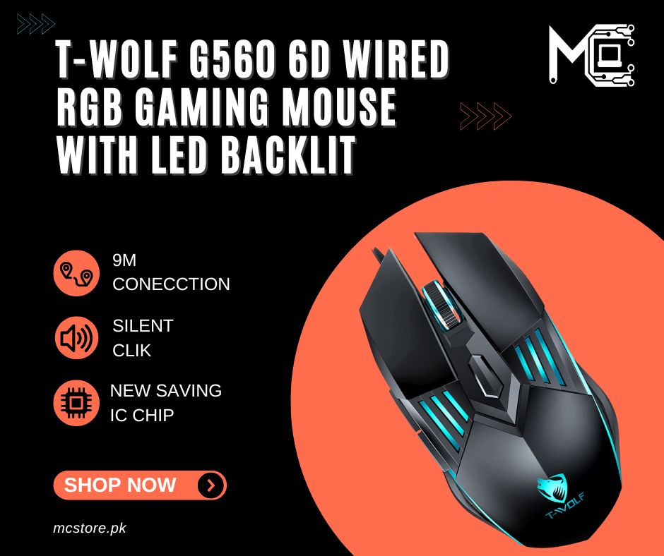 T-WOLF G560 6D Wired RGB Gaming Mouse – LED Backlit USB Optical Mouse with Breathing Light for Laptop/Desktop